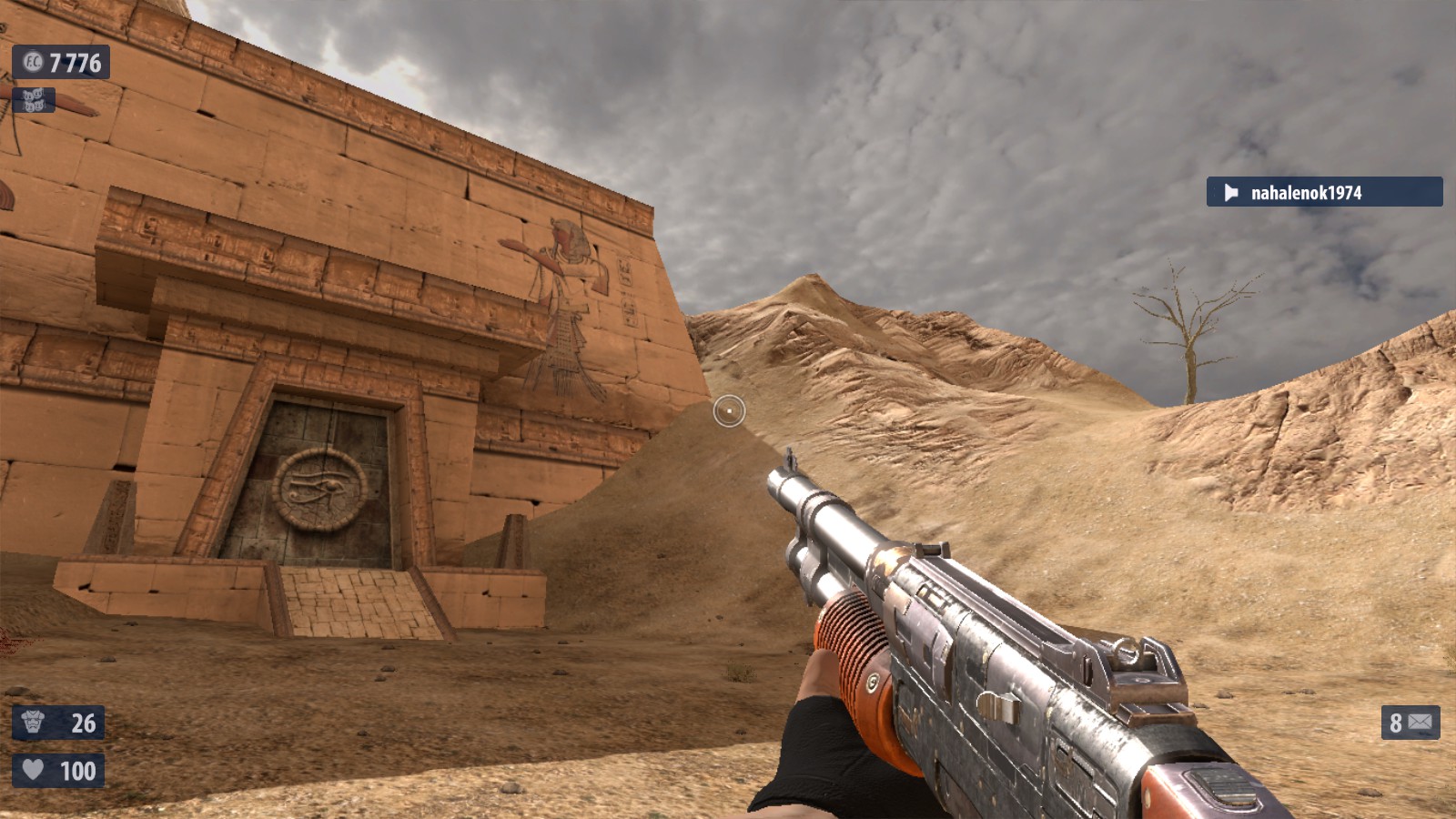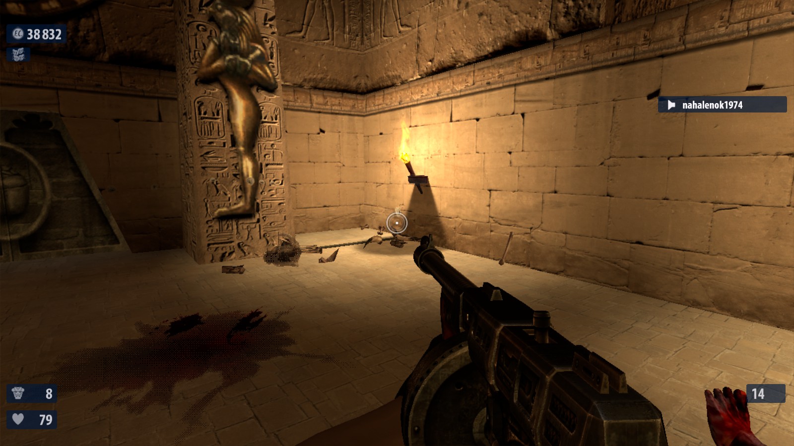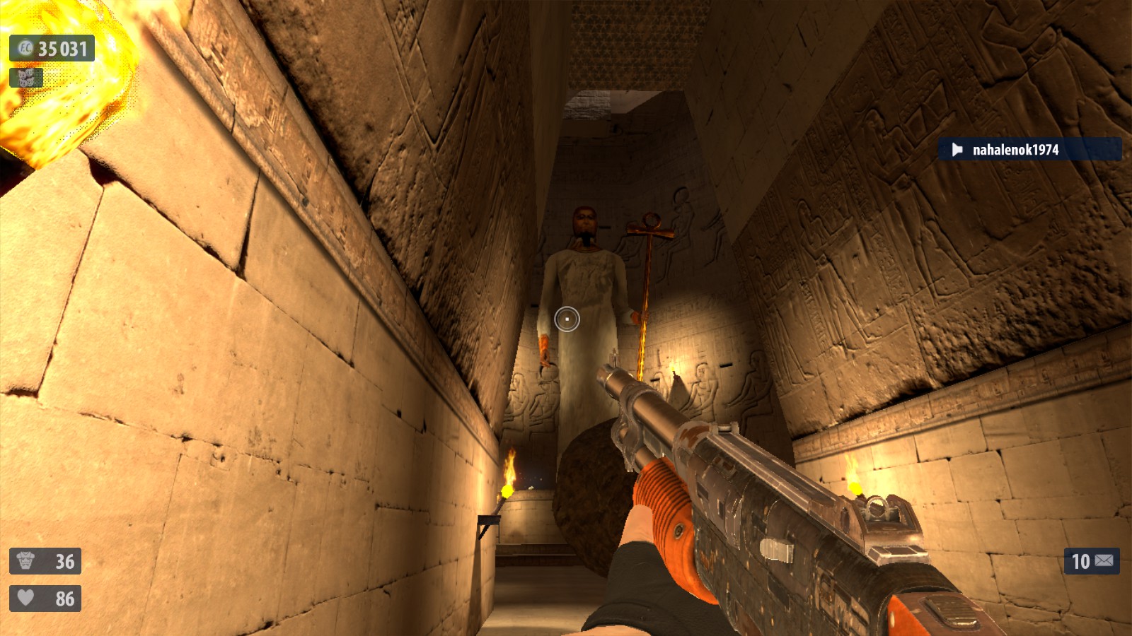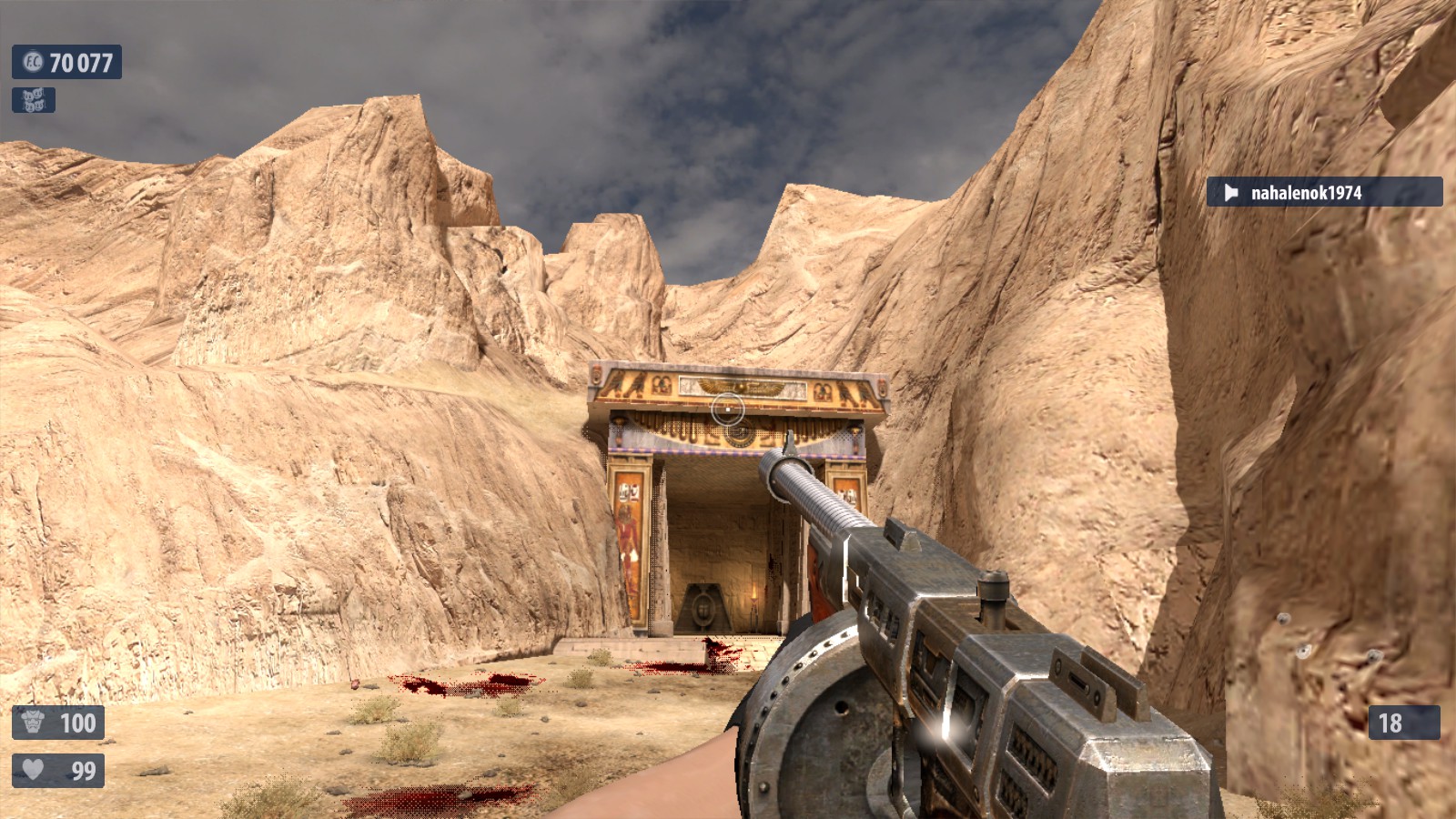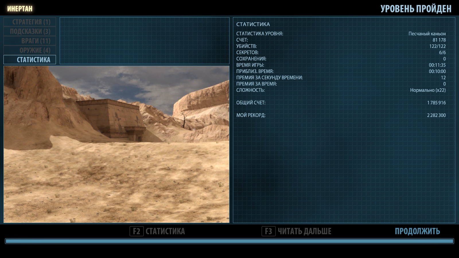 Выхожу один я на дорогу... И нам на встречу выбегает безголовый придурок с парой мешков в руках. Не успев сказать ква мы даем по нему залп и его разносит в клочья. Обиженные таким обращением, его собратья по безголовию кидаются на нас целым стадом. Перестреляв их, читаем, что это Кричащие камикадзе. Двойка вам, создатели игры! Камикадзе - это пилоты-самоубийцы на самолетах, а люди-самоубийцы , обвязанные взрывчаткой в японской армии назывались Тайсентай. Ну а то , что они орут, это их проблемы :) Убедив всю местную живность, что ей лучше, когда она мертвая, покидаем негостеприимную пустыню. Когда выйдете в темный коридор, где за закрытыми воротами пробегут Камикадзе (будем звать их так, раз создатели игры нарекли их этим титулом), будьте осторожны - когда ворота откроются и вы выскочит е, то слева сверху навернется большой камушек, который раздавит вас, если вы не отскочите в сторону. Проходим насквозь все залы до комнаты, где на нас прыгают куча Лягушат. Конечно, они такие же лягушата, как я - слонопотам, но прыгают так же. Завалив всех в этой комнате, смотрим справа от входа - под первым из окошек плита более темная - тыкаемся и берем в открывшейся нише автомат Томпсона (этот секрет помог найти SanZ - 1 из 6). Взяв, выбегаем в двери. Сразу берем влево и за колонну - нас подбрасывает вверх и в полете рулим вправо - на колонне стоит бронежилет (2 из 6). Посмотрев вперед, видим в стене окно. В него и запрыгиваем. Сразу слева - идет спуск. Под спуском маленькая пещерка - здоровье (3 из 6). Далее выходим снова в пустыню, где познакомимся с Сирийским Быком и Малым одульником, посиневшим от страха. Оба они откидывают копыта (причем бык в буквальном смысле :) после двух выстрелов в упор из двустволки. Но у меня такая мысль, что где-то в ненайденных секретах лежит ракетница, так как следующий секрет я нашел на крыше портала, который выводит нас из этой пустыни. Но запрыгнуть туда я просто так не смог - ракетницы для Рокет-джампа у меня не было. Так что я позволил быку поднять меня на рога и он могучим ударом зашвырнул меня наверх (4 из 6). Правда , только с 3-й попытки - в остальные разы я просто пролетал мимо. Или можно пройти до упора слева а потом подпрыгнуть . Кстати, в этой пустыне при взятии всяких мелочей могут сверху скинуть шибко большой булыжник, так что внимательнее. К сожалению, больше секретов я не нашел, однако на следующем уровне я отыгрался - там я нашел ВСЕ секреты.