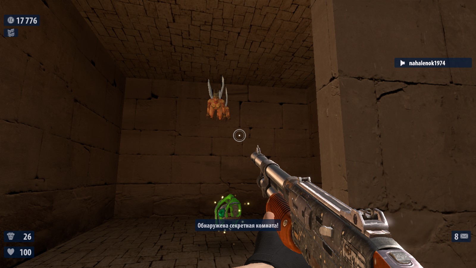 Последний секрет на этом уровне (7 из 7). Опять же в первой пустыне, встав лицом к выходу, обходим его справа и запрыгиваем вдоль стены. Стена отодвигается и там обнаруживается небольшая компания птичек и патроны. Ура! Кстати, нашел я его после того, как неудачно попытался рокет джампом залететь на соседний секрет. Меня отшвырнуло влево и я активировал этот секрет, сам того не желая.