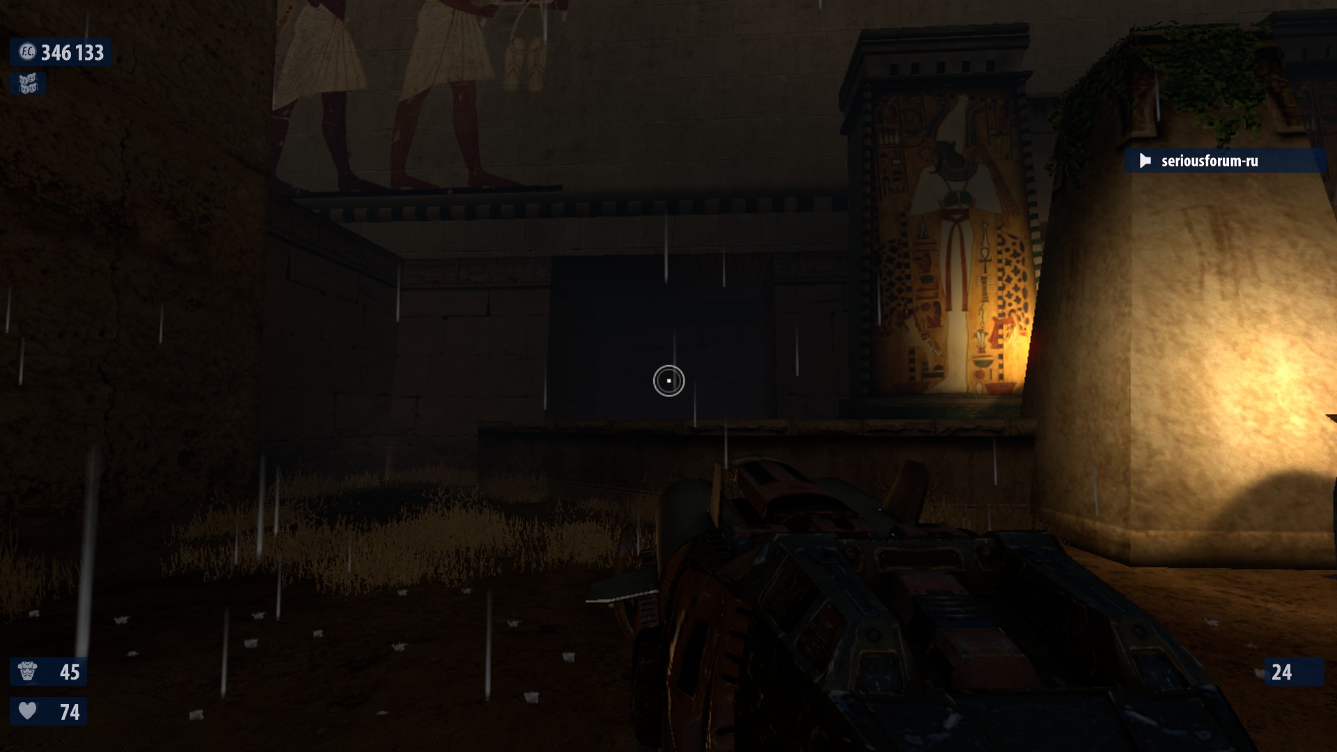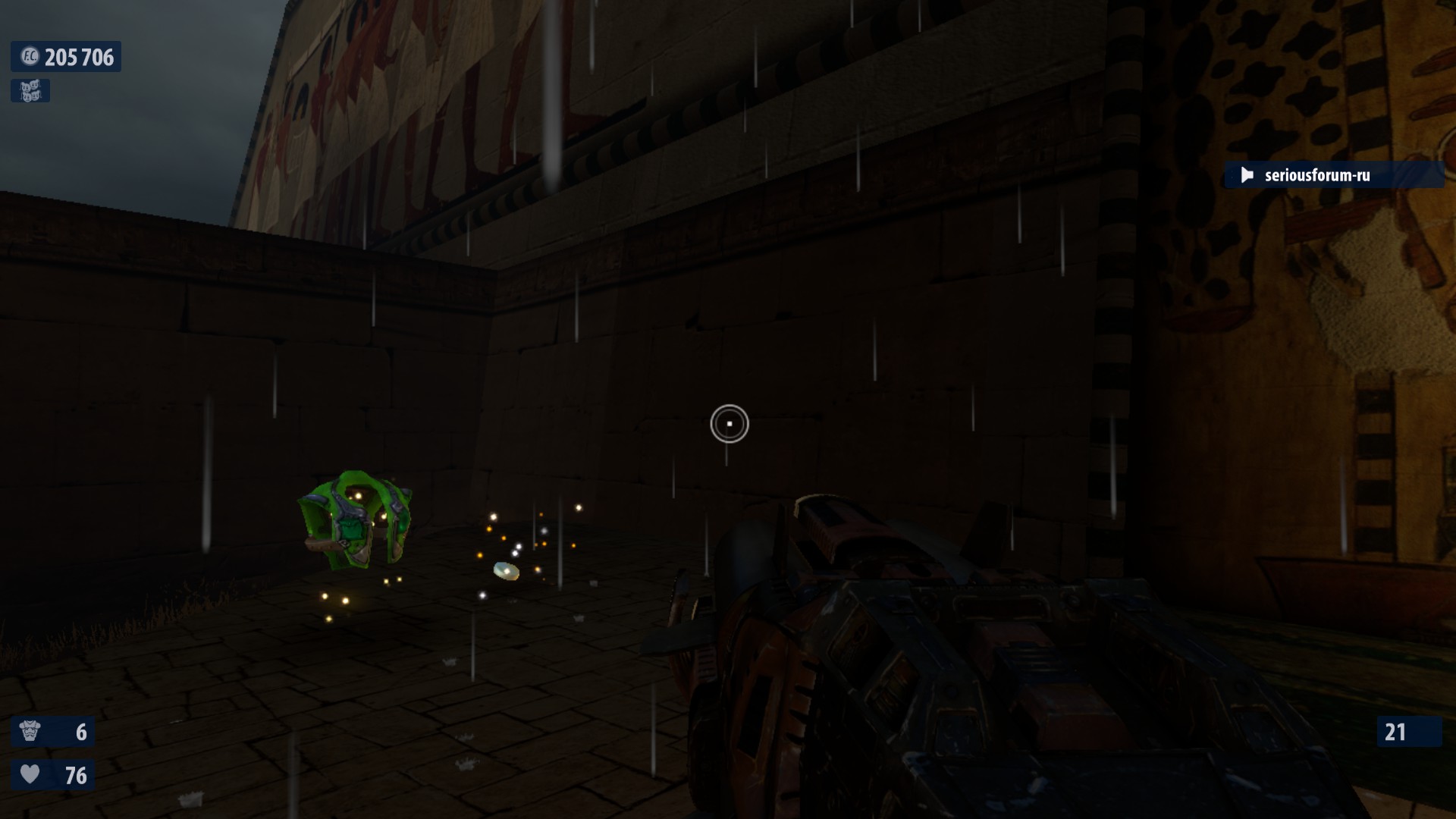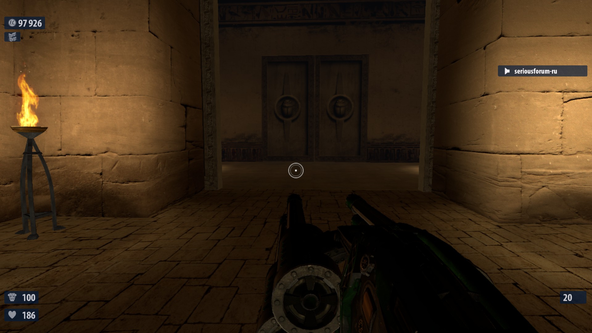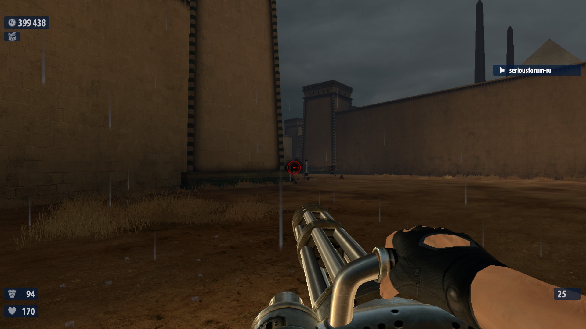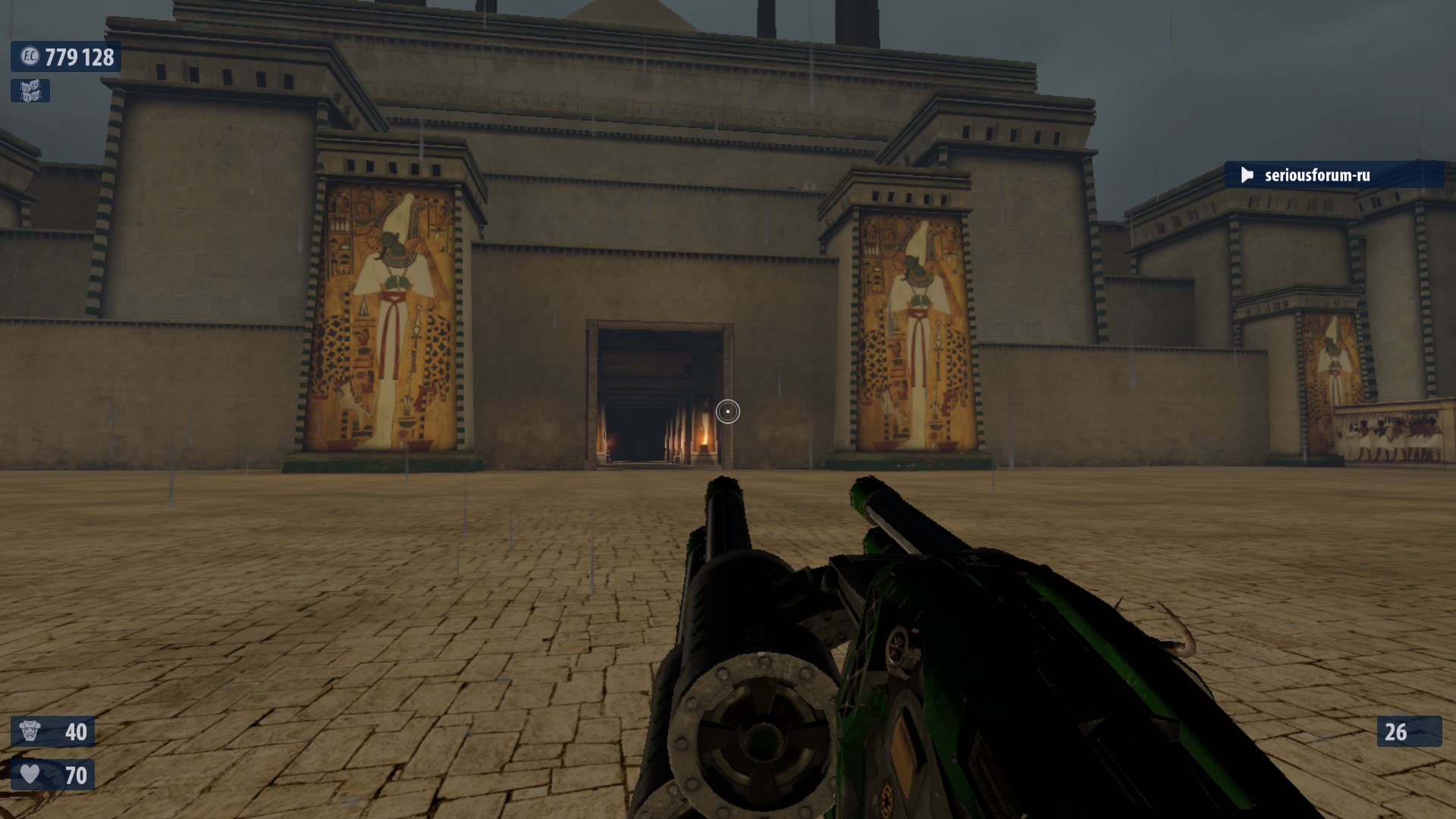Ну а теперь несколько советов для тех, кто играет на ОЧКИ и хочет пройти по нормальному пути. Пройдя в первой зале через черные дуги , мы откроем ворота дальше и наживем себе жуткий геморрой - там за воротами город, в котором нам надо для выхода найти 4 жука в домах. Это не сложно. Сложно то, что в ЭТОМ городе твари появляются при проходе через улицы и там их жутко много, особенно пулеметчиков-скорпионов и безголовых всех сортов. Ну а когда вы выйдете в следующую часть уровня - дорогу между домов, то первая середина уровня проста - до ямы с гвоздями. Вот после него на нас несется гигантское стадо быков, а потом еще большее стадо Кли. Если лупить по ним из оружия, то это слишком жирно - никаких патронов не хватит, так что я сделал так. Первый бык всегда спокойно падает в яму и там загибается. Второй тоже несется, но плита выдвигается и он оказывается на нашей стороне. Надо отпрыгнуть в сторону перед самым его носом, но так, чтобы оказаться на плите и успеть на ту сторону раньше, чем плита задвинется назад. Если же вы будете стоять на той стороне, то