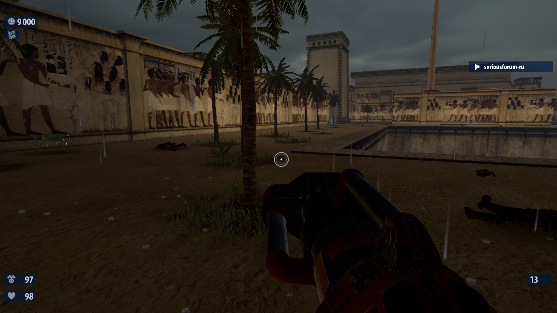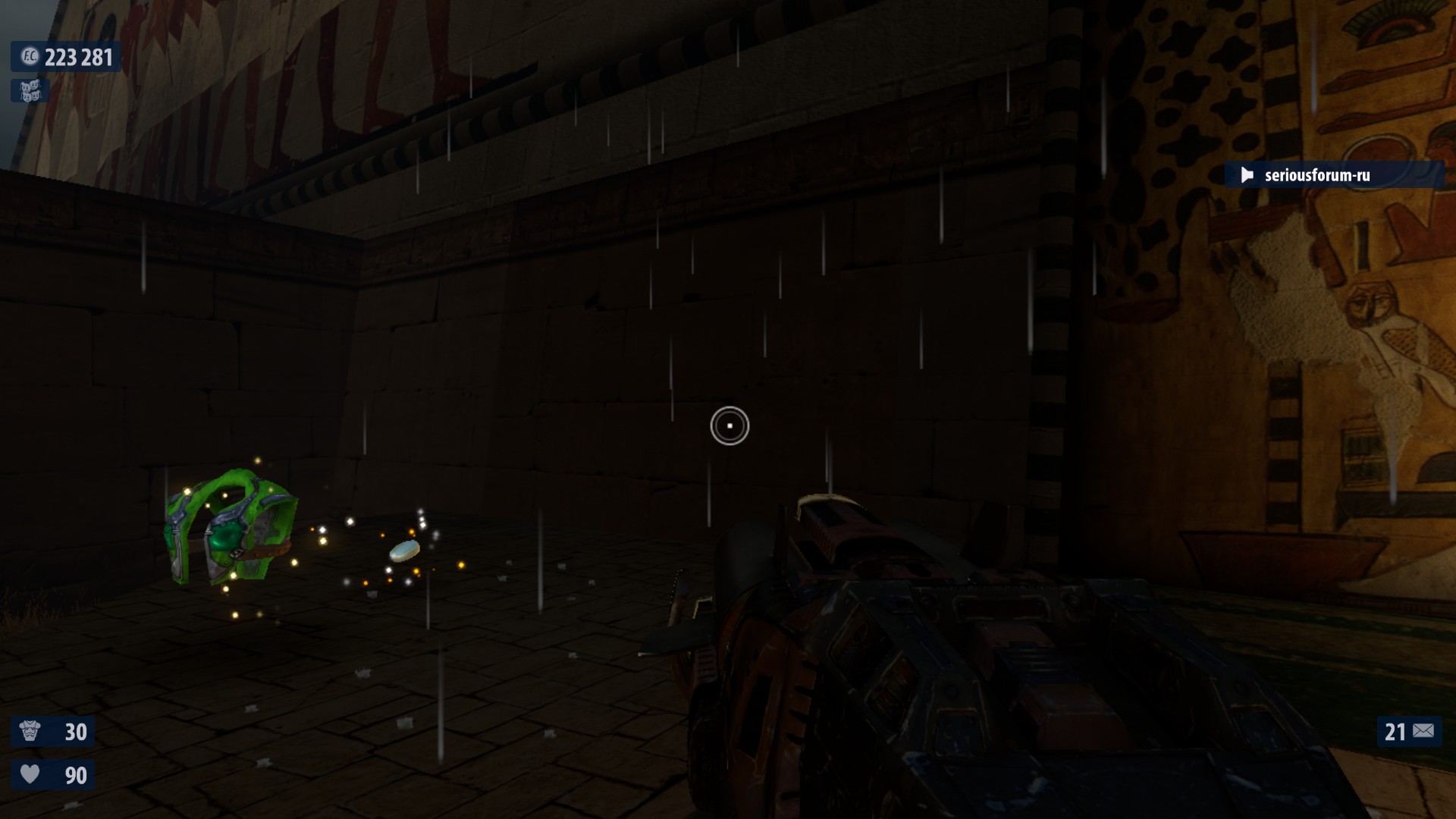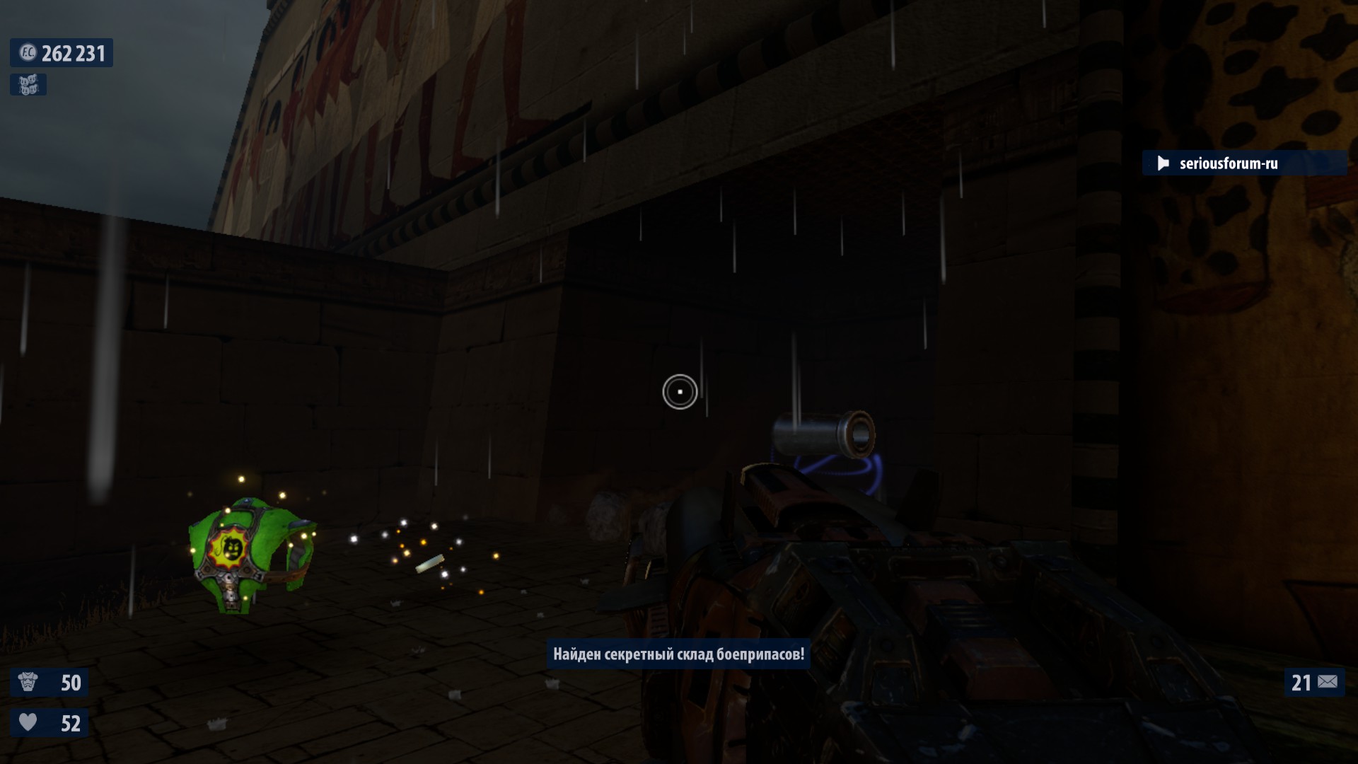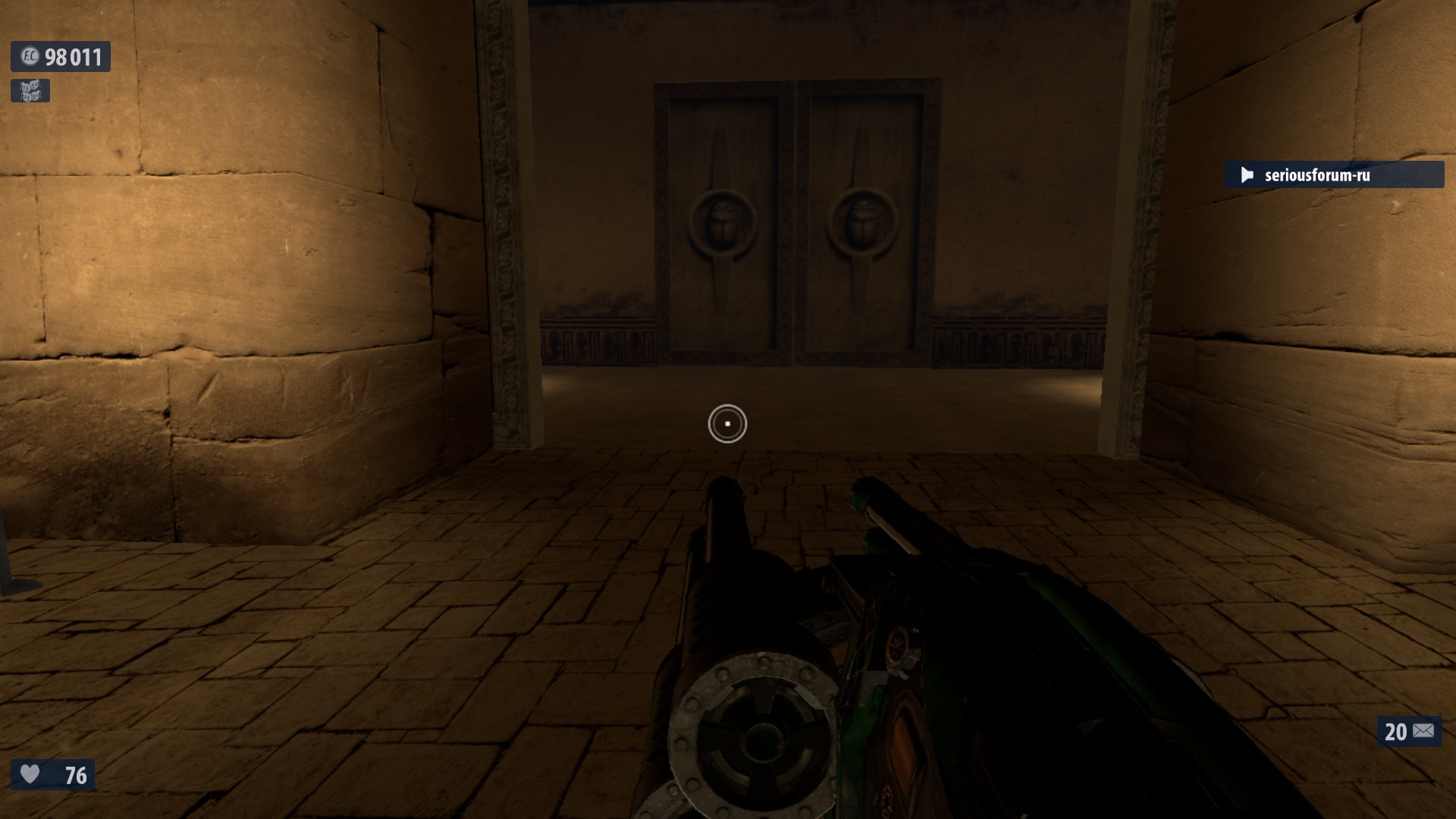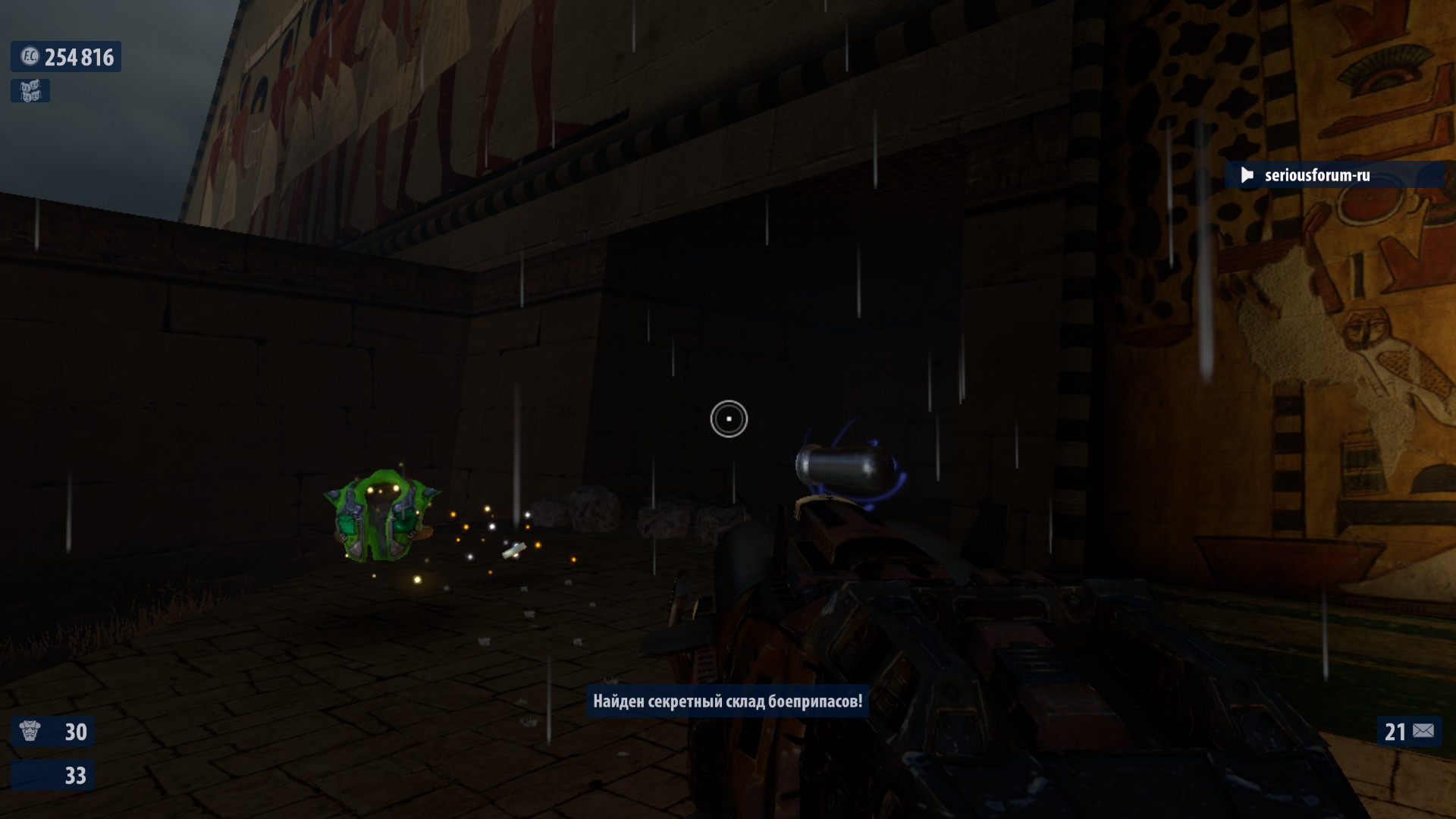 Ну а теперь несколько советов для тех, кто играет на ОЧКИ и хочет пройти по нормальному пути. Пройдя в первой зале через черные дуги , мы откроем ворота дальше и наживем себе жуткий геморрой - там за воротами город, в котором нам надо для выхода найти 4 жука в домах. Это не сложно. Сложно то, что в ЭТОМ городе твари появляются при проходе через улицы и там их жутко много, особенно пулеметчиков-скорпионов и безголовых всех сортов. Ну а когда вы выйдете в следующую часть уровня - дорогу между домов, то первая середина уровня проста - до ямы с гвоздями. Вот после него на нас несется гигантское стадо быков, а потом еще большее стадо Кли. Если лупить по ним из оружия, то это слишком жирно - никаких патронов не хватит, так что я сделал так. Первый бык всегда спокойно падает в яму и там загибается. Второй тоже несется, но плита выдвигается и он оказывается на нашей стороне. Надо отпрыгнуть в сторону перед самым его носом, но так, чтобы оказаться на плите и успеть на ту сторону раньше, чем плита задвинется назад. Если же вы будете стоять на той стороне, то