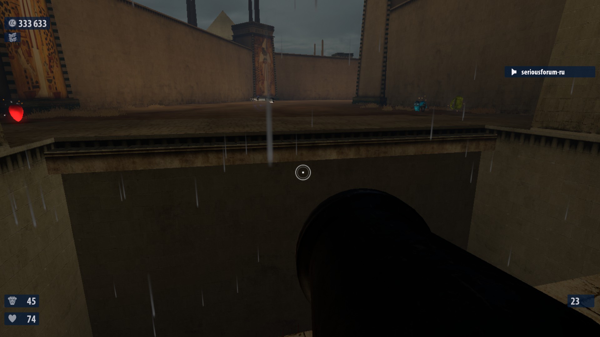 Ну а перескочив ОБЯЗАТЕЛЬНО ПО ПЛИТЕ (рокет джампом нельзя - плита будет продолжать работать) на другую сторону, выбегаем к углу и видим очередного быка, а то и пару. Несемся назад и Рокет Джампом перелетаем назад. Отбегаем почти до поворота. Быки валятся в яму. НО!!! Бегайте из стороны в сторону, так как упавший в яму бык умирает сразу, но не сразу исчезает и второй, упавший на него выскакивает из ямы на нашу сторону. Ну а если мы мечемся влево – вправо , быки падают в разные мести и дохнут. Можно пройти всех быков, не потеряв ни одного патрона. Когда быки иссякнут, подбегаем (обычно плита закрывается) и мы спокойно