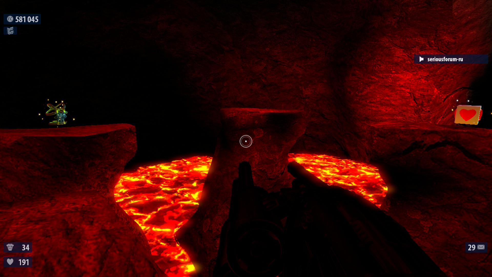Перед нами заснеженная деревушка, в одном из ближних домиков за дверью(серьезный бонус - 1). На мельнице есть включатель. Побежит (жадный Дед Мороз - 2), еслиего медленно убивать он будет щедрее (лучше пистолетами). Здесь же есть снеговик ,разносим его, получаем (броню - 3). Ну и в трубе одного из домов можно найти еще одного (типа - 4), застрял в трубе и кряхтит. Его тоже надо убить. Выходим в снежное ущелье. Здесь лучше использовать пулемет и лазер. Идем через ущелье и перед нами опять деревушка, здесь сразу два снеговика-секрета. Итак, в одном из ближних домов за дверкой есть (бессмертие - 5). Рядом берем броню, этим активируя ближнего снеговика. Мочим его, берем (патроны - 6). Спрва за домиками есть еще один снеговик, жмем на выключатель, появляется еще один (жадный Дед Мороз - 7).Выходим на последнюю снежную площадь, здесь (матрешный снеговик - 8). Уничтожив его и двух красненьких цыплят, идем в пещеру. Выйдя на первую дорожку, падаем в разрушенную ее часть, и попадаем на верхнюю дорожку, где есть (сердце - 9),спрыгиваем вниз и идем дальше через пещеру. Опять дорожки над пропастью, в какой -то момент становятся виден выступ впереди на скале (посмотрите в винтовку ). входу к пещере, слева за камнем находим (пушку - 11). Выходим из пещеры, тут я подумал, как наверно офигительно бывает в аду. Идем по тропке над лавой и спускаемся вниз к дорожке из лавовых камней. Прыгаем на левый крайний камень и подъезжаем к(броне- 12). Возвращаемся к дорожке, доходим до мостика, под одним из его оснований найдем (сердце -13). Проходим дальше через телепорт, и оказываемся на ледовой площадке.