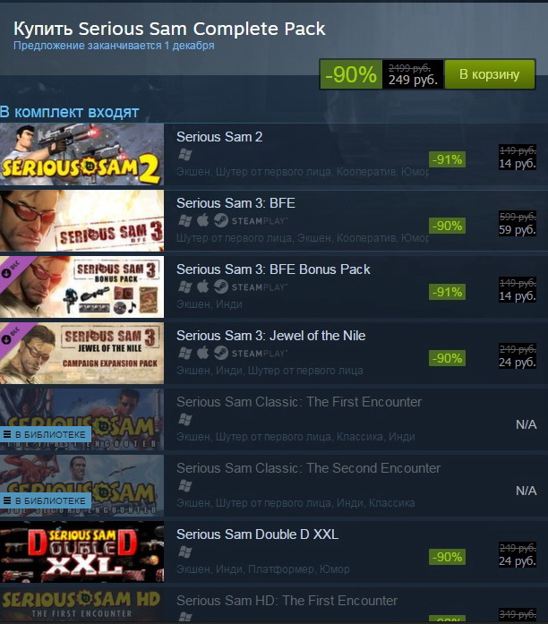 Для тех, кто еще не в курсе: вчера вечером в сервисе Steam началась осенняя распродажа, заканчивающаяся 1 декабря. И потому, на всю серию Serious Sam Croteam установили скидки в 90% на каждую! Успейте приобрести!