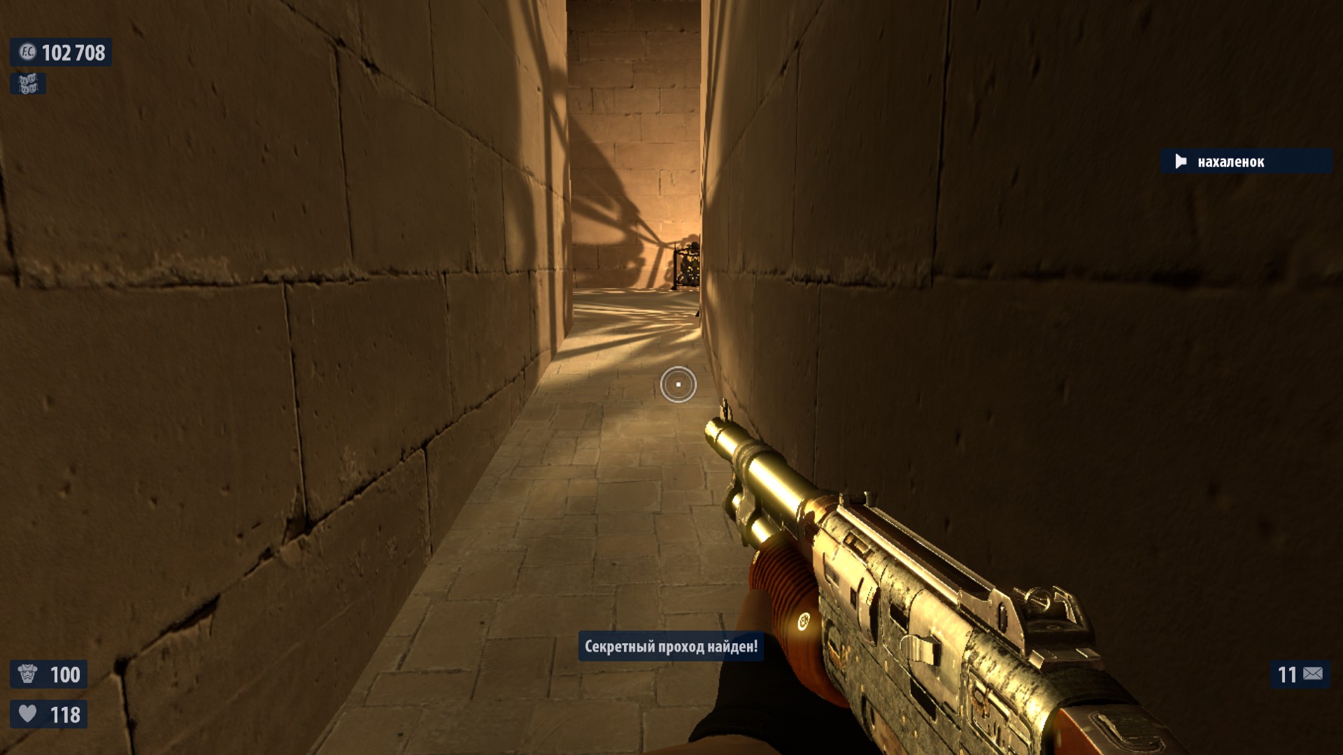 7) Перед тем как ты войдешь в огромный зал с двустволкой и кучей врагов (слева и справа от входа в него стоят 2 статуи). К этой комнате ты подойдешь, после того как разберешься с арахноидом, засевшим за твоей спиной над лестницей, по которой ты поднимаешься. Встань спиной к входу в этот зал и пройди вперед, пока не упрешься в стену, затем повернись вправо. Ты увидишь небольшой проход. Пройди через него, чтобы получить сообщение о секретном проходе и попасть в комнату с патронами.