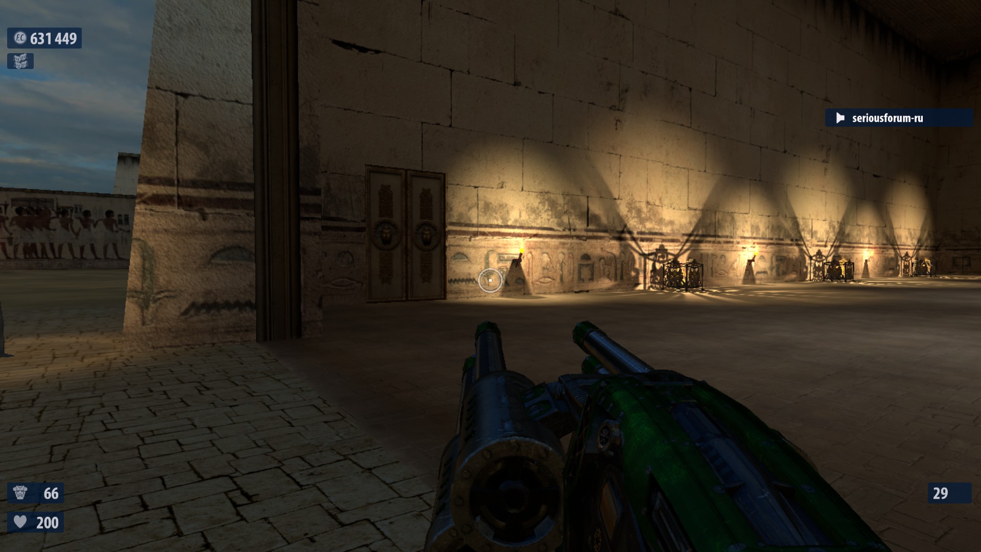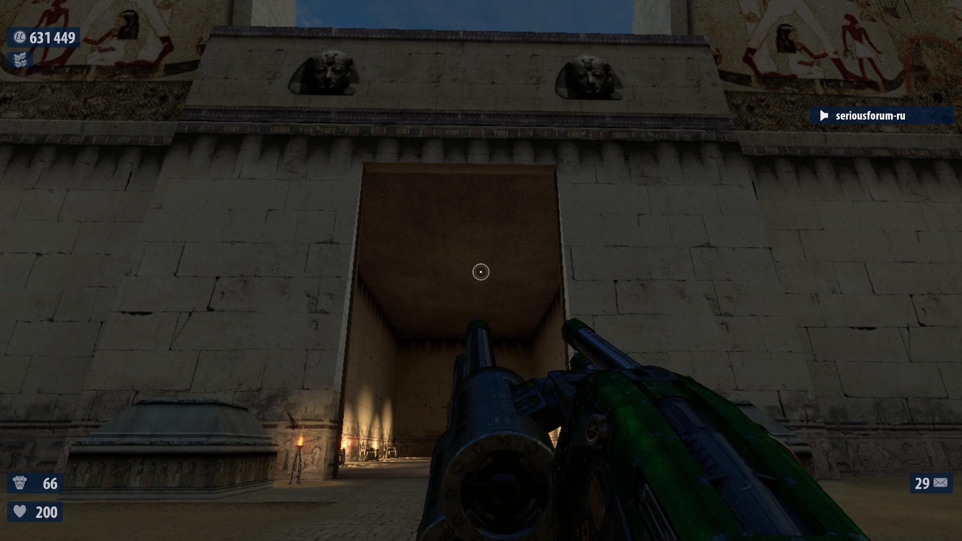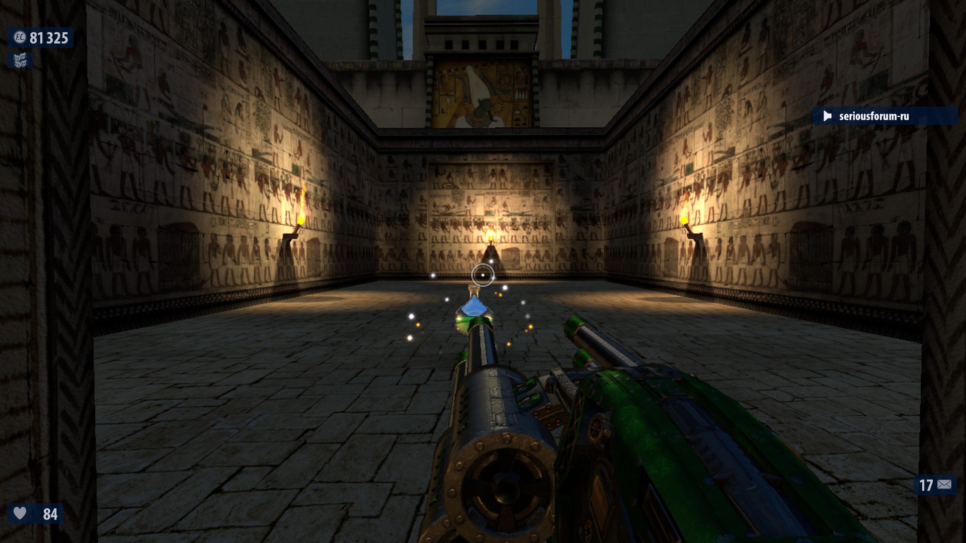 Этот уровень выведет нас на второй секретный уровень, но это будет уже в самом конце нашей прогулки. Выбежав на большую площадь, лично я приготовил Пушку с ядрами, так как из-за двери впереди вдруг стадами на нас вываливаются быки, Кли и другие твари. Ядра позволяют давить их оптом, сразу прорезая в рядах нападающих целые просеки. Справа и слева есть дорожки, на которые можно запрыгнуть Рокет Джампом, но мы потом и так туда попадем, так что не тратьте ракеты и здоровье. Вырвавшись на следующую площадь, мы видим ворота впереди, но чтобы пройти через них, надо взять два медальона в комнатах справа и слева. Но комнаты - это я так, в шутку сказал. Каждая из этих 'комнат' представляет собой мини-уровень, щедро сдобренный кучей тварей, ловушек и других приколов. Итак, в центре площади, где мы стоим, находится громадная статуя. Если вы набираете очки, то пальните в нее из ракетницы - из нее вместе с осколками посыплется несколько Кли. Назову эту площадь с Колонной-Кли. Ну а теперь идем вправо и назад - мы выходим на ту дорожку, на которую я не советовал заскакивать Рокет Джампом. Теперь там выходим на площадь с четырьмя громадными столбами. Стреляем из ракетницы в первый слева и во второй справа - они рушатся и появляется много ядер для Пушки (теперь понятно, почему я так щедро лупил из Пушки по тварям в начале