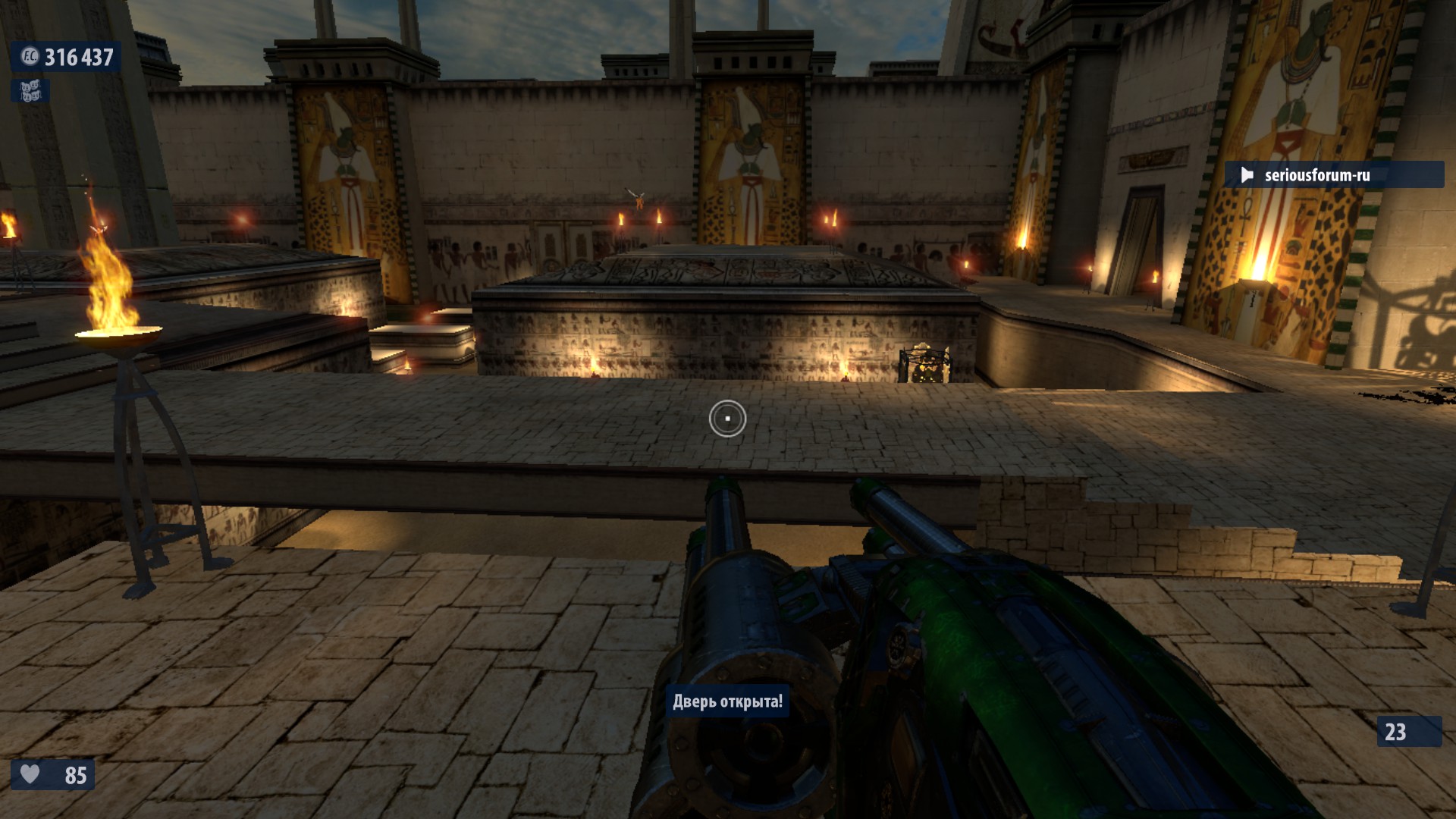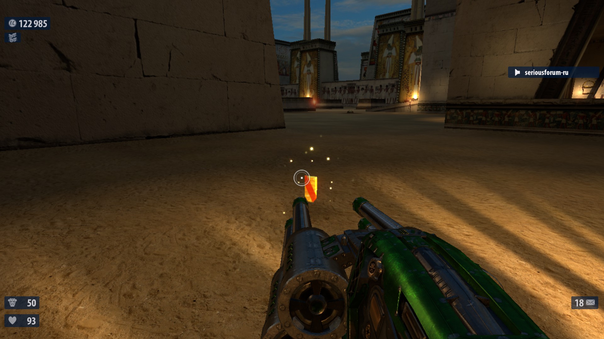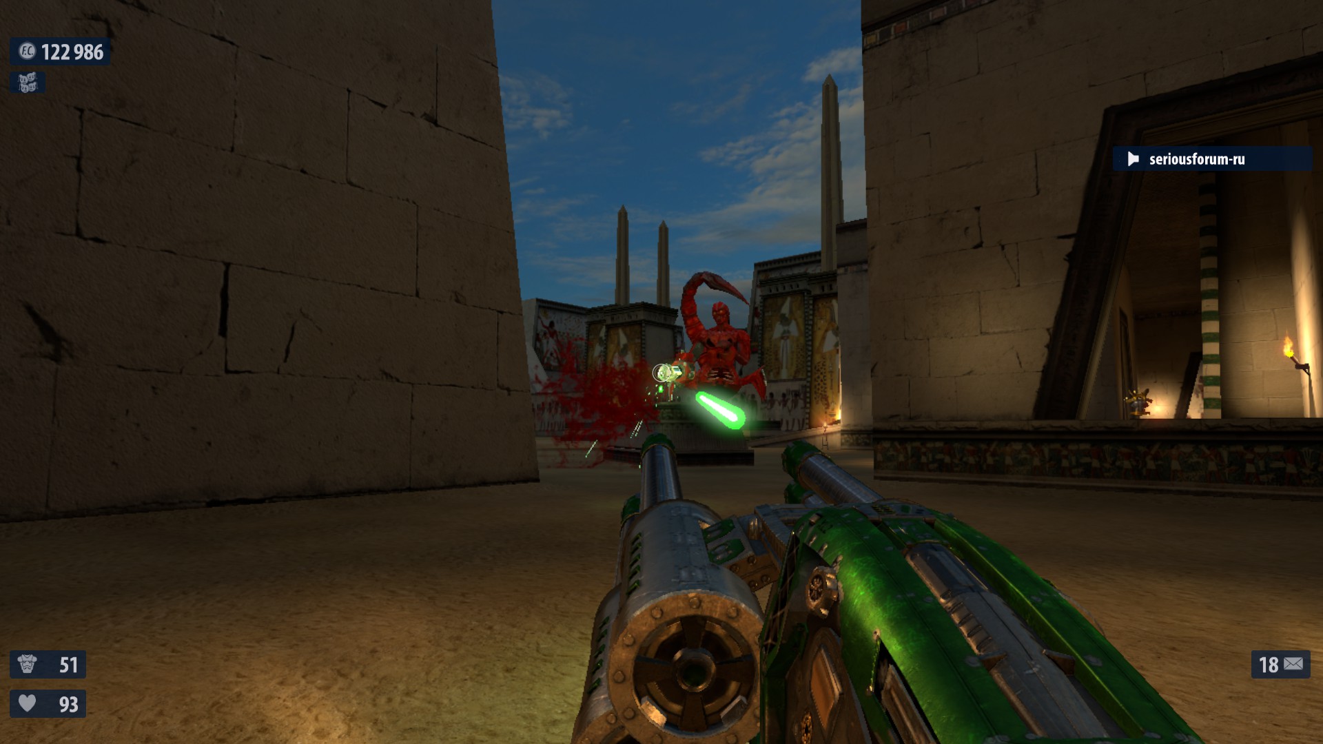 Этот уровень выведет нас на второй секретный уровень, но это будет уже в самом конце нашей прогулки. Выбежав на большую площадь, лично я приготовил Пушку с ядрами, так как из-за двери впереди вдруг стадами на нас вываливаются быки, Кли и другие твари. Ядра позволяют давить их оптом, сразу прорезая в рядах нападающих целые просеки. Справа и слева есть дорожки, на которые можно запрыгнуть Рокет Джампом, но мы потом и так туда попадем, так что не тратьте ракеты и здоровье. Вырвавшись на следующую площадь, мы видим ворота впереди, но чтобы пройти через них, надо взять два медальона в комнатах справа и слева. Но комнаты - это я так, в шутку сказал. Каждая из этих 'комнат' представляет собой мини-уровень, щедро сдобренный кучей тварей, ловушек и других приколов. Итак, в центре площади, где мы стоим, находится громадная статуя. Если вы набираете очки, то пальните в нее из ракетницы - из нее вместе с осколками посыплется несколько Кли. Назову эту площадь с Колонной-Кли. Ну а теперь идем вправо и назад - мы выходим на ту дорожку, на которую я не советовал заскакивать Рокет Джампом. Теперь там выходим на площадь с четырьмя громадными столбами. Стреляем из ракетницы в первый слева и во второй справа - они рушатся и появляется много ядер для Пушки (теперь понятно, почему я так щедро лупил из Пушки по тварям в начале