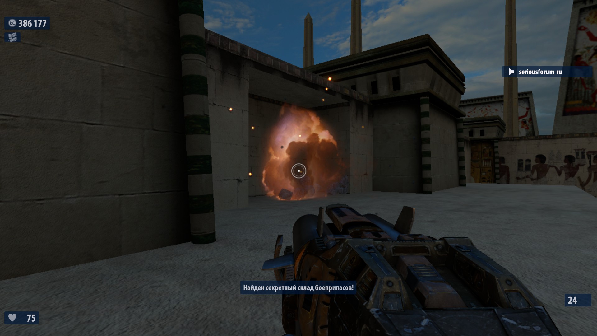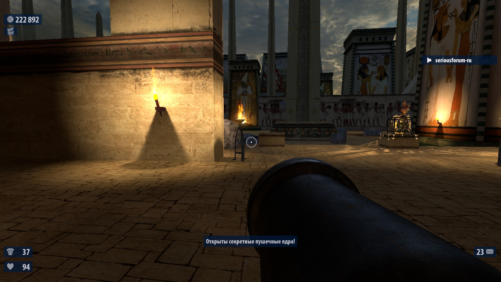 4) В правой части карты (там, где находится перо), во дворе перед другим, содержащим перо, посередине стоят 5 башен/колонн. Ты можешь взорвать 2 из них, те, что ближе к правому краю двора. Когда взорвешь их, получишь сообщение, что найдена секретная пушка. Или ядра. Или заряды к лазерке.