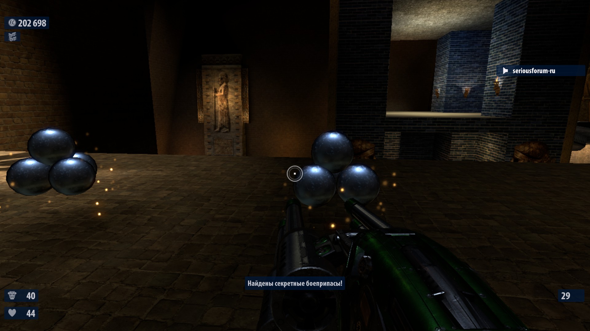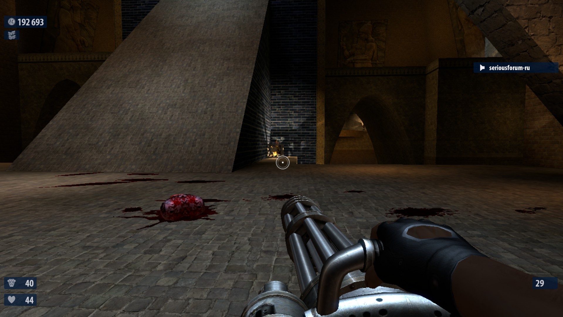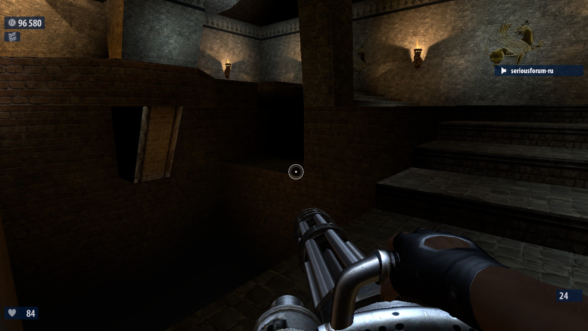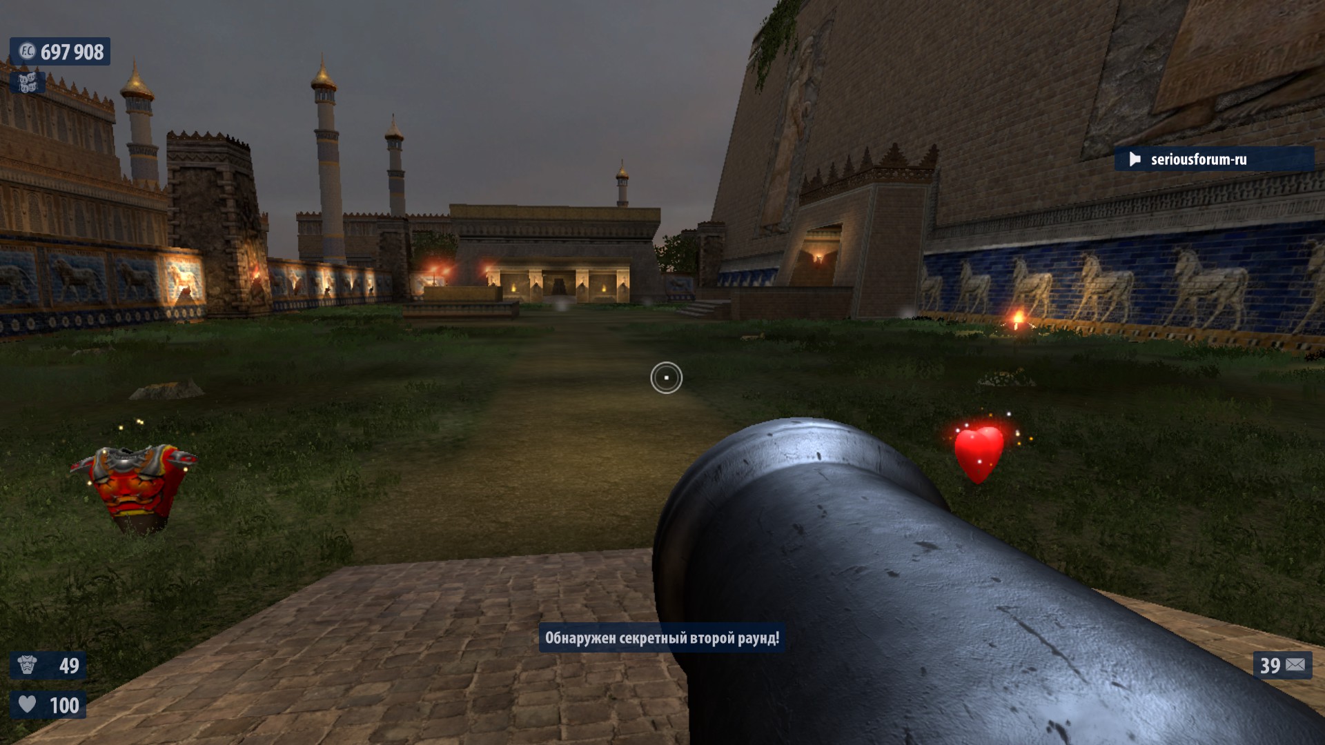 Церемониальный зал. Слева от выхода в нише имеются (патроны -1). Далее идем до пропасти. Справа под лестницей видно (сердце - 2). Но перед ним есть невидимый телепорт. Просто обходим его. После первого пролета спускаемся по лестнице – в нише есть (патроны - 3). Далее спускаемся на лифте вниз, где выстрелив в норку из ракетницы, вызываем (бычков - 4). Проходим все лестницы и пролеты. После крутого спуска поворачиваем налево за угол, за факел. Там трамплин выталкивает на выступ с (боезапасом - 5). Выходим к башне. Слева в стене есть башенка, стреляем в нее ,там (телепорт - 6) на студию, где есть броня и если все разнести кроме самого себя, то и сердце. В походе за третьей картой, около монолитной плиты в закутке есть темный квадрат, а там (бессмертие - 7). В следующей комнате таблетка и