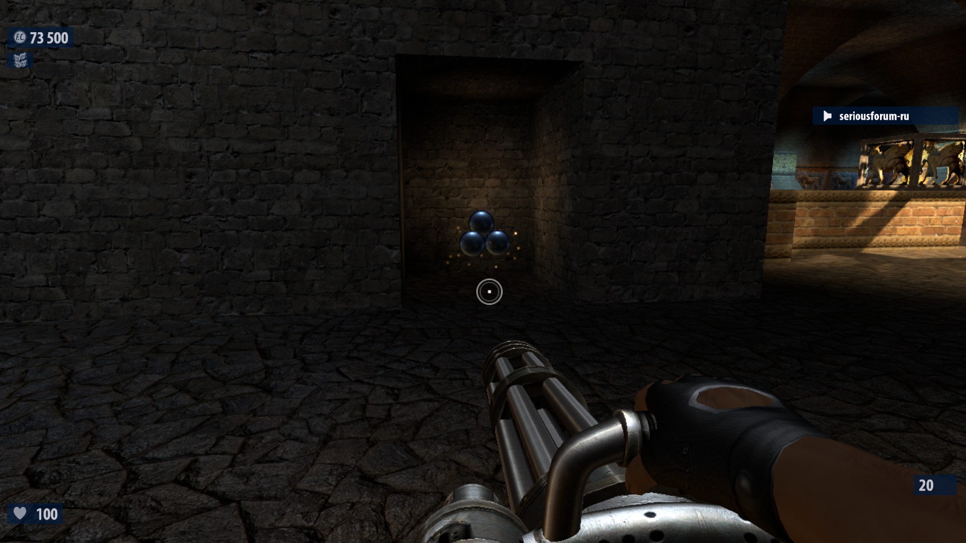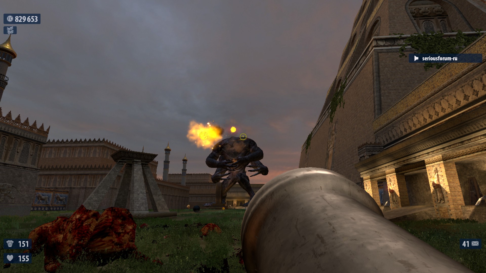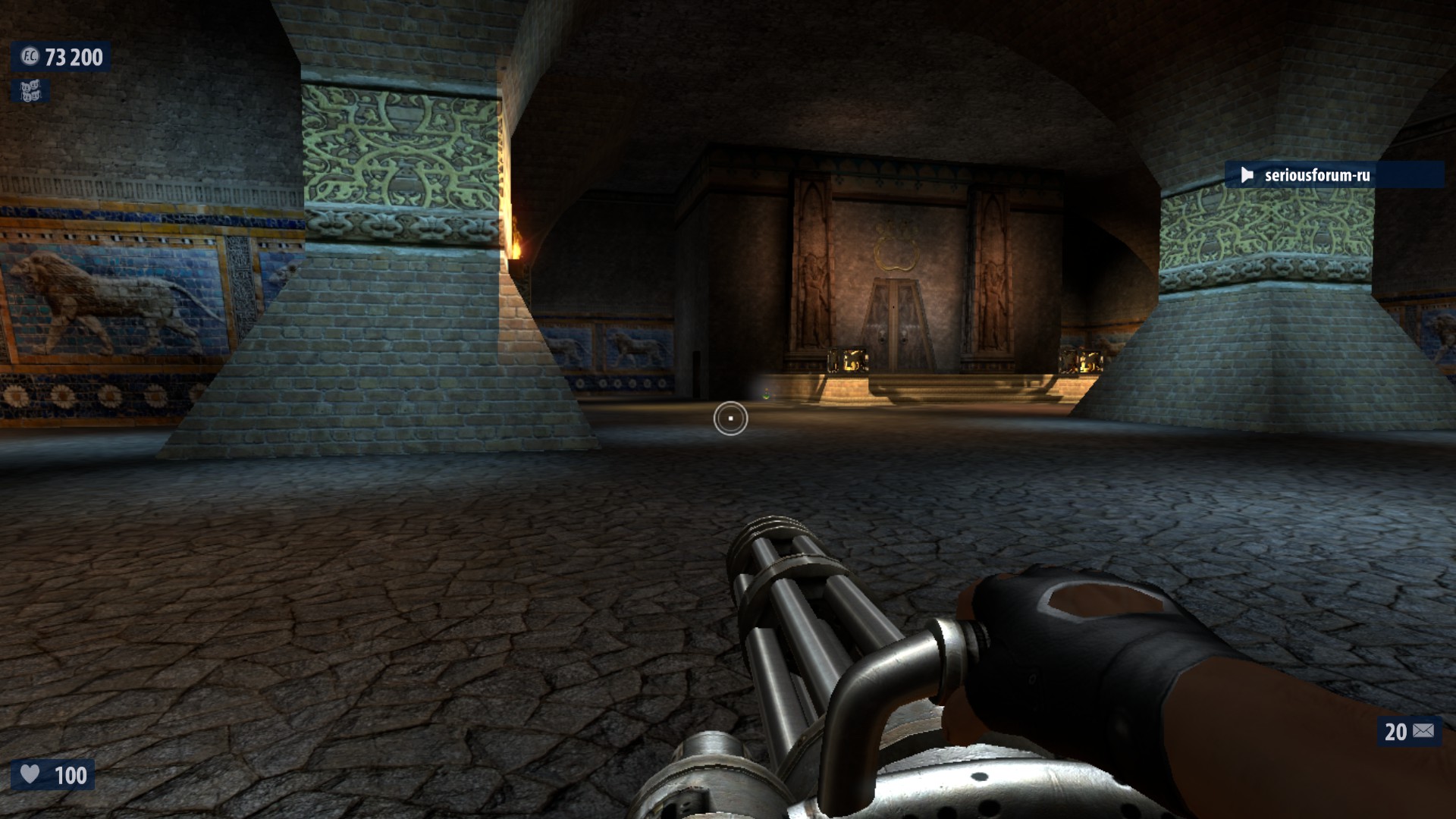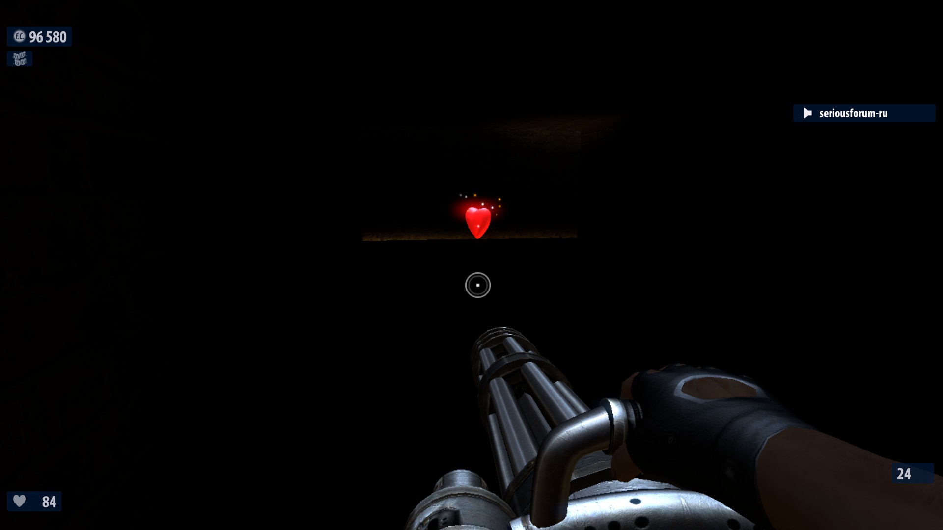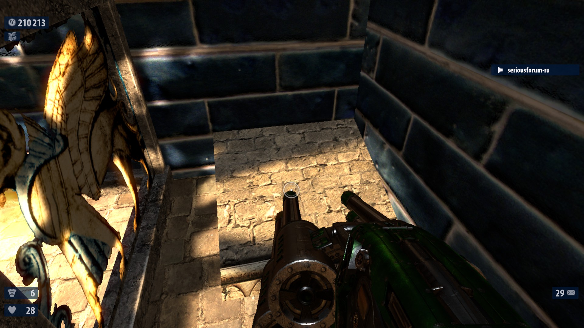 Церемониальный зал. Слева от выхода в нише имеются (патроны -1). Далее идем до пропасти. Справа под лестницей видно (сердце - 2). Но перед ним есть невидимый телепорт. Просто обходим его. После первого пролета спускаемся по лестнице – в нише есть (патроны - 3). Далее спускаемся на лифте вниз, где выстрелив в норку из ракетницы, вызываем (бычков - 4). Проходим все лестницы и пролеты. После крутого спуска поворачиваем налево за угол, за факел. Там трамплин выталкивает на выступ с (боезапасом - 5). Выходим к башне. Слева в стене есть башенка, стреляем в нее ,там (телепорт - 6) на студию, где есть броня и если все разнести кроме самого себя, то и сердце. В походе за третьей картой, около монолитной плиты в закутке есть темный квадрат, а там (бессмертие - 7). В следующей комнате таблетка и